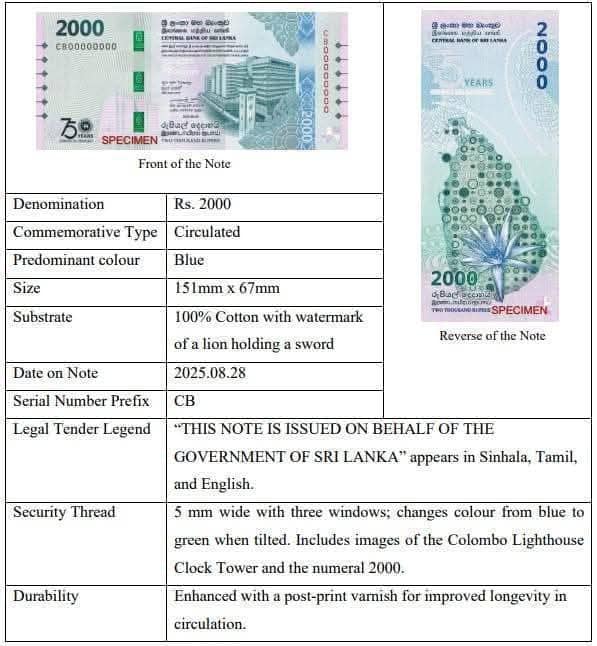 இலங்கை மத்திய வங்கியின் 75 ஆவது ஆண்டுநிறைவை முன்னிட்டு 2025.08.29 அன்று 2000 ரூபா ஞாபகார்த்த நாணயத்தாளை வெளியிட்டுள்ளது.