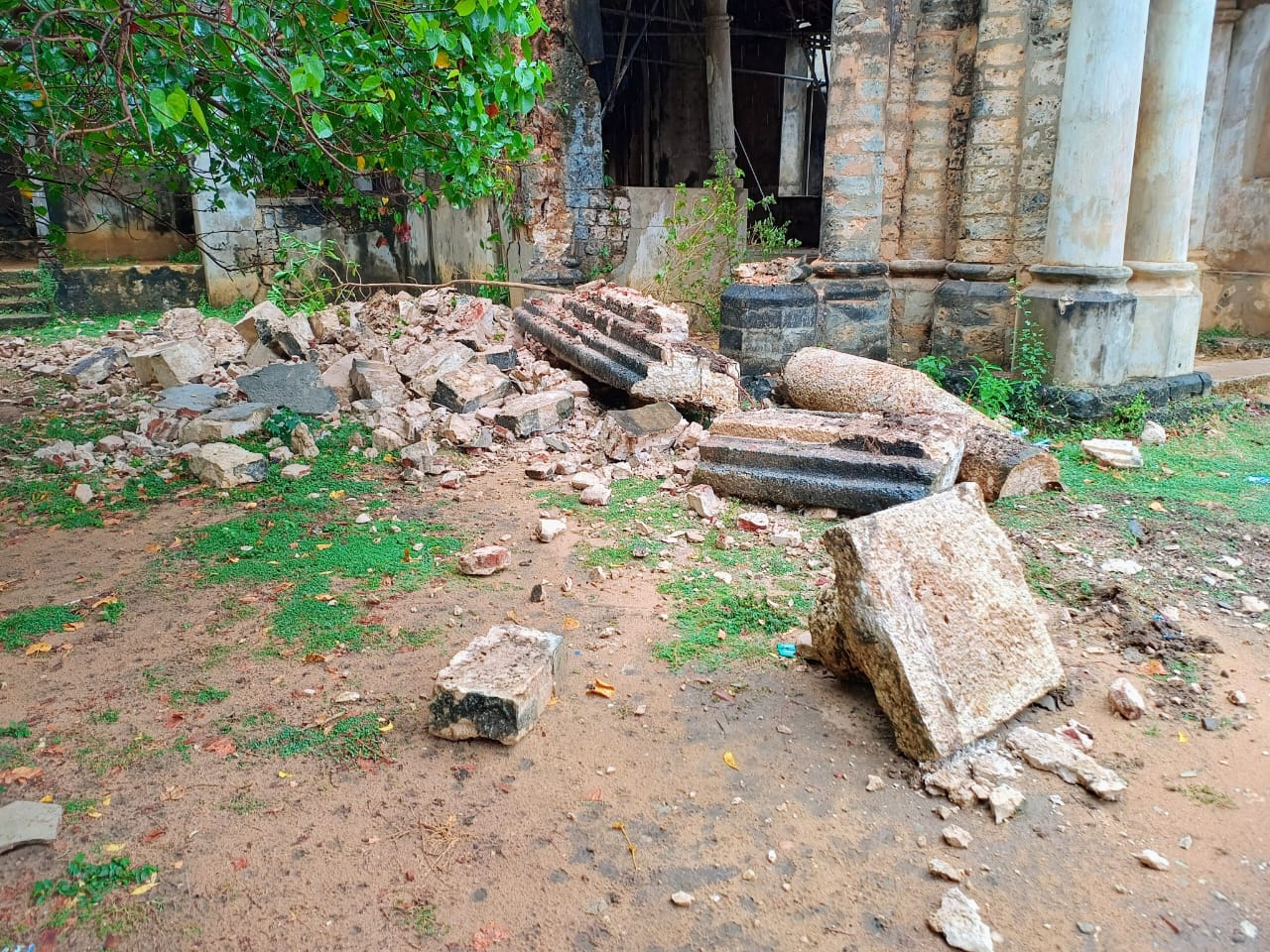 அந்தக் கட்டடம் உடைந்து விழும் நிலையில் காணப்பட்டிருந்ததால்,அதற்கு முட்டுக்கொடுத்து கம்பிகள் நடப்பட்டிருந்தன.