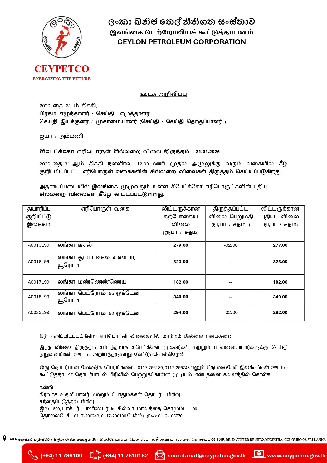 இலங்கை பெற்றோலியக் கூட்டுத்தாபனம் மாதாந்திர விலை சூத்திரத்தின்படி, கடந்த 31 அம்மா திகதியில் இருந்து எரிபொருள் விலையை குறைக்க தீர்மானித்துள்ளது.