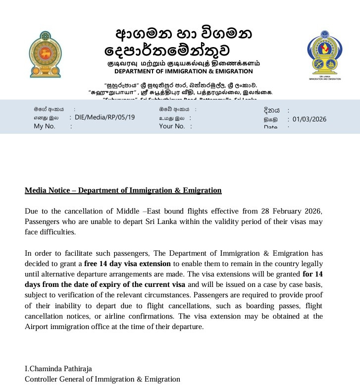 குறித்த அறிக்கையில் மேலும் தெரிவிக்கப்பட்டுள்ளதாவது, கடந்த 2026 பெப்ரவரி 28 முதல் விமானங்கள் ரத்து செய்யப்பட்டுள்ள நிலையில் பாதிக்கப்பட்ட பயணிகளின் தற்போதைய விசா காலாவதியாகும் திகதியிலிருந்து இந்த 14 நாட்கள் சலுகைக்காலம் நடைமுறைக்கு வரும்.